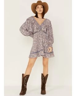 Angie Women’s Navy Long Sleeve Smocked Floral Border Mini Dress