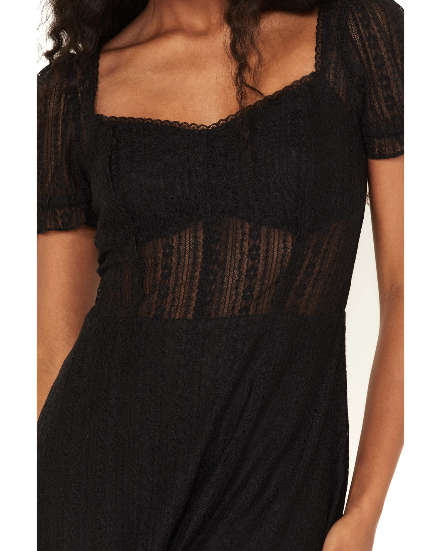 - Solid black design with see through lace torso design