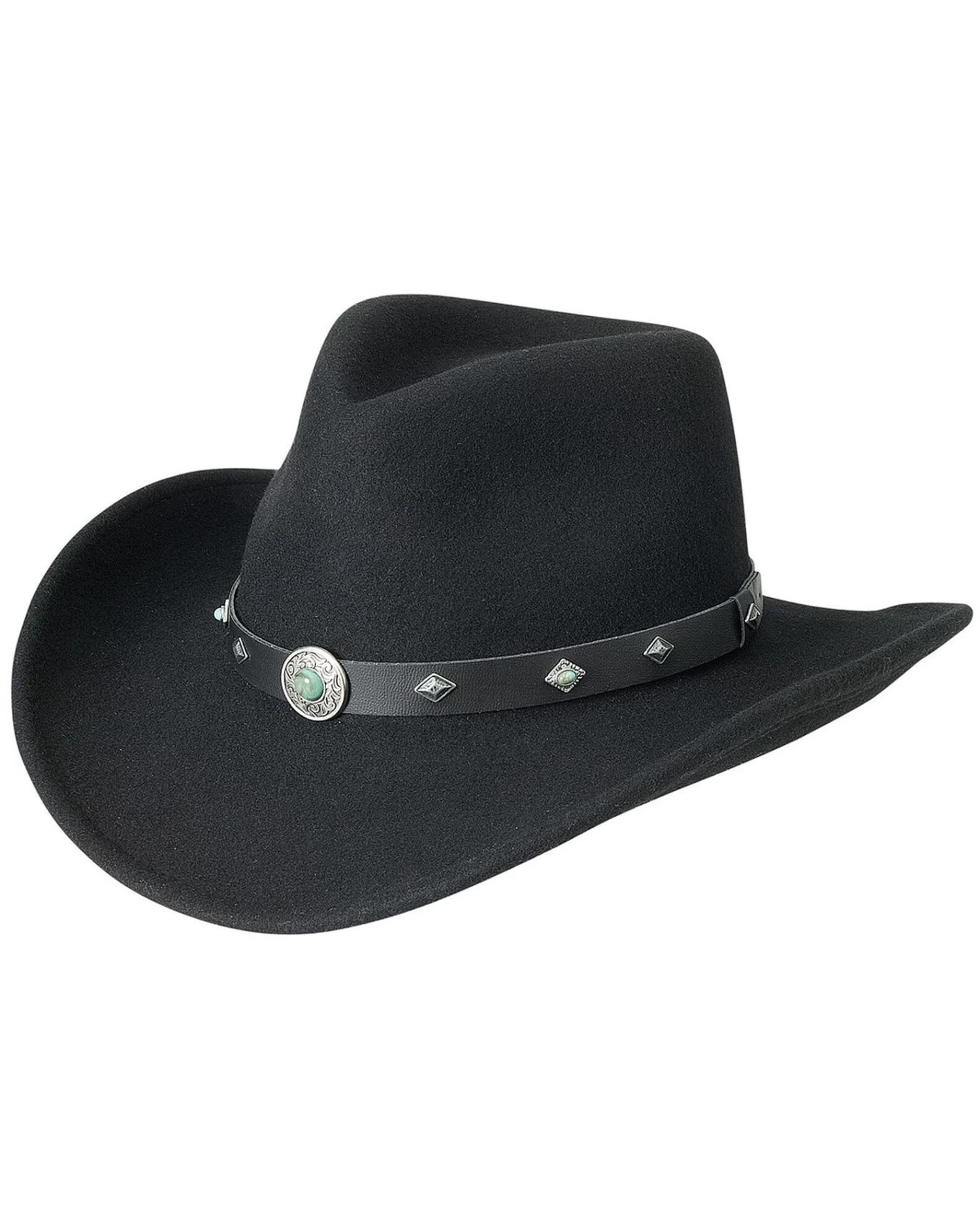 - Hat band adorned with diamond-shaped conchos with faux turquoise stones