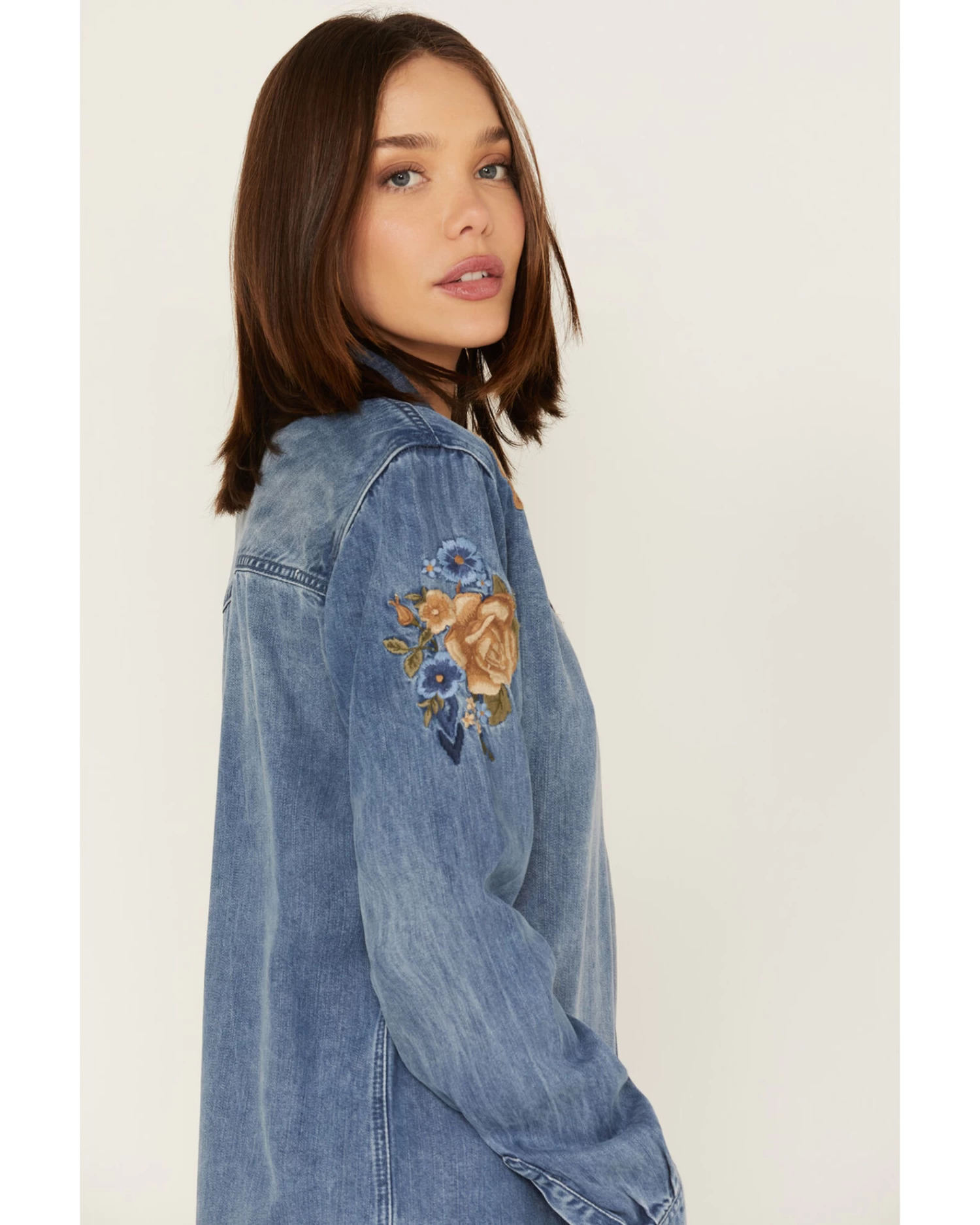 Stetson Women’s Floral Embroidered Medium Wash Long Sleeve Button Down Shirt